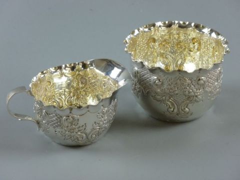 A HALLMARKED TWO PIECE STRAWBERRY SET with crimped rims and embossed and chased floral swag decoration, London 1886, 3.7 troy ozs total