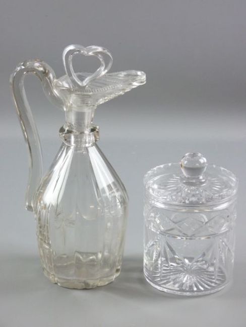 TWO 19th CENTURY & LATER CUT GLASS ITEMS including a facet cut claret jug with later stopper, 28.5 cms approximately maximum height not including stopper and a cut glass biscuit jar and cover, 17 cms high, 12 cms diameter