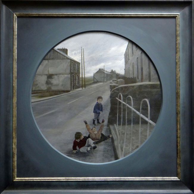 DAVID CARPANINI oil on canvas - circular mounted painting of three boys playing in a valleys street, entitled and signed verso ‘Two’s Company’, dated 1973, 62cms diam