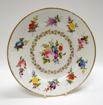 A SWANSEA PORCELAIN DESSERT PLATE finely painted with a series of ten sprigs of colourful flowers to the border and a centre spray of wild-flowers, impressed SWANSEA mark to base, 22cms diam