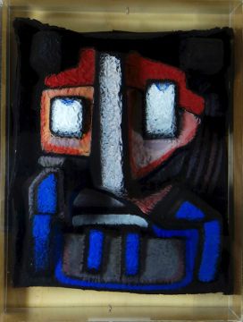 JEAN-PAUL RIEUX three - dimensional mixed media construction behind perspex - cubic gargoyle-like face in relief, 33 x 27cms. Provenance: Washington Gallery, Penarth