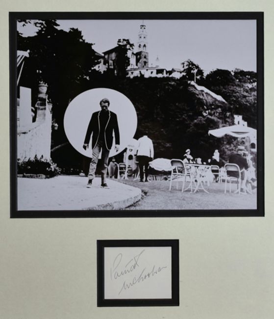 PATRICK McGOOHAN AUTOGRAPH framed as one with a black and white still photograph of the actor on location at Portmeirion Village in North Wales for the filming of ‘The Prisoner’, 20 x 25cms