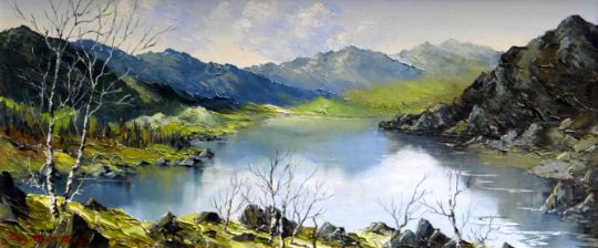 CHARLES WYATT WARREN oil on board - Snowdonia scene entitled verso ‘Llyn Cwm Bychan’, 24 x 54cms