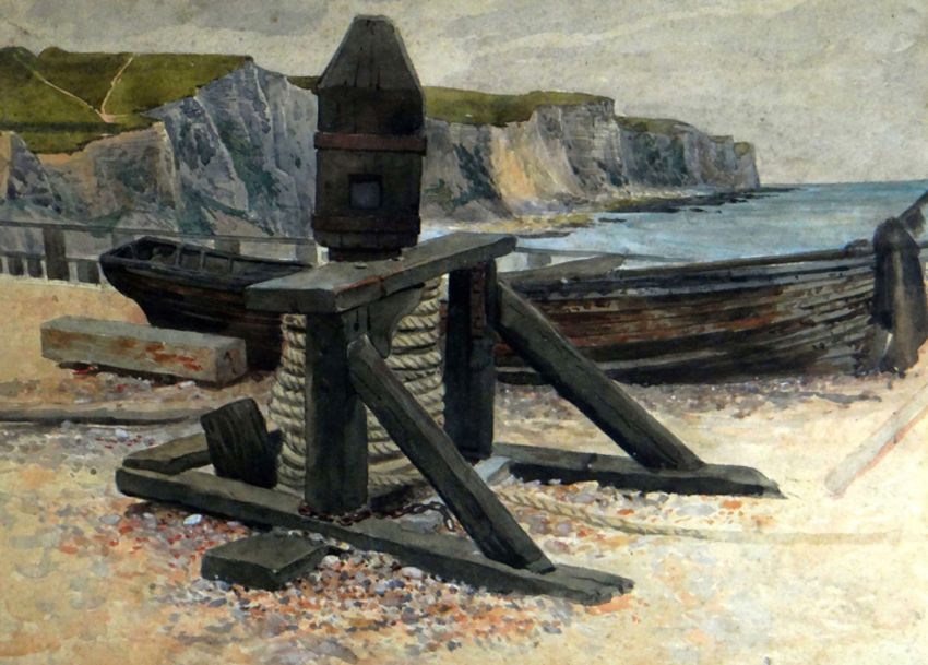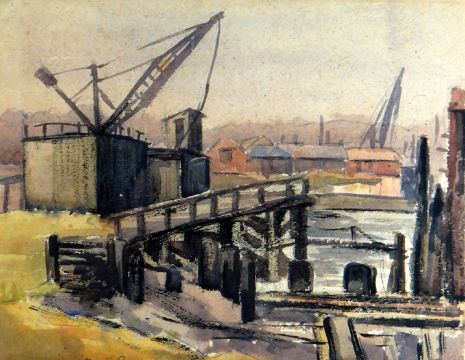 MAURICE BARNES a pair of watercolours - beach scene with old fishing boats, 25 x 34cms and a dockland scene, signed, 28 x 35cms