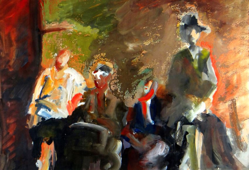 JOHN UZZELL EDWARDS mixed media - figures in a landscape, entitled verso ‘Family Group’, 38 x 55cms
