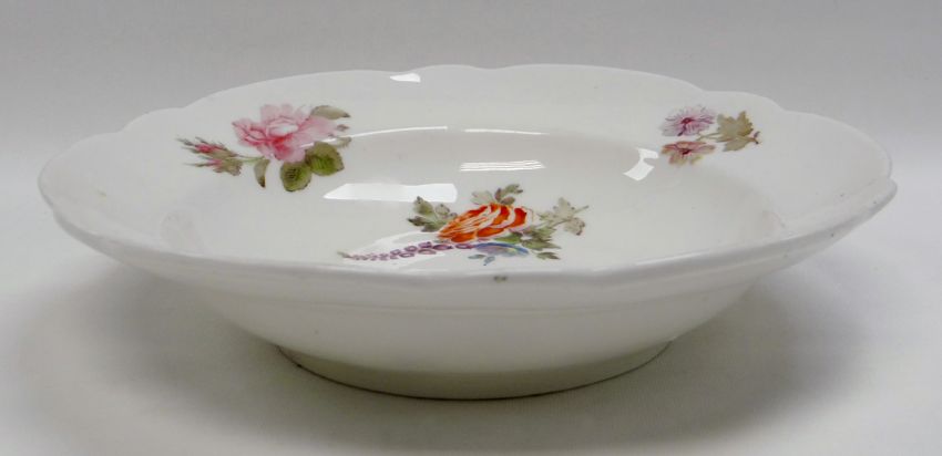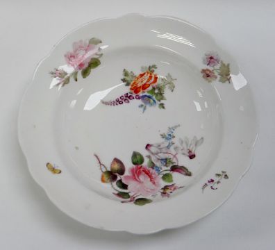 A NANTGARW SOUP DISH PAINTED BY THOMAS PARDOE of lobed form and decorated internally and to the border with sprays of flowers and a single butterfly to the border, impressed NANT GARW CW mark to base, 25cms diam