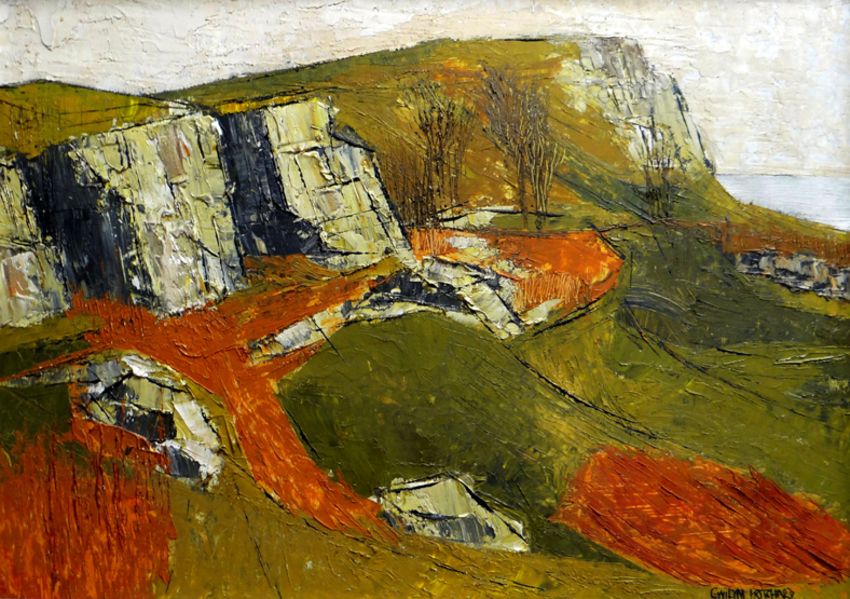 GWILYM PRICHARD oil on board - rocky mountain top entitled verso, ‘Rocks, Penmon’, signed, 37 x 51cms