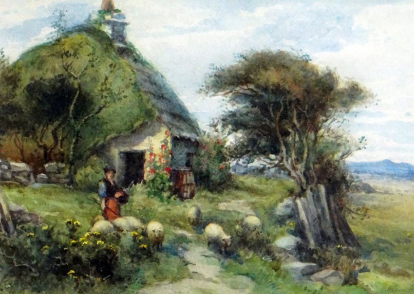 NELLIE CLOUGH watercolour - thatched rural cottage with figure and sheep on a path, signed, 12.5 x 17.5 cms. Auctioneer’s note: the artist was the sister of the better known North Wales landscape artist Tom Clough (1867-1943)