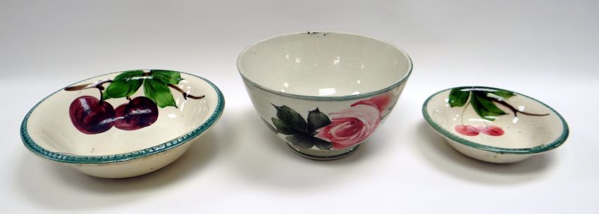THREE LLANELLY POTTERY BOWLS comprising a shallow bowl painted with plums, 16cms diam a small bowl with cherries, 11cms diam and a larger bowl with roses, 14cms diam