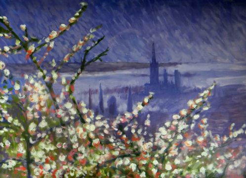 RALPH SPILLER oil on board - view of cathedral through blossom tress, entitled verso ‘Cherry Blossom, Loire’, signed, 42 x 59cms