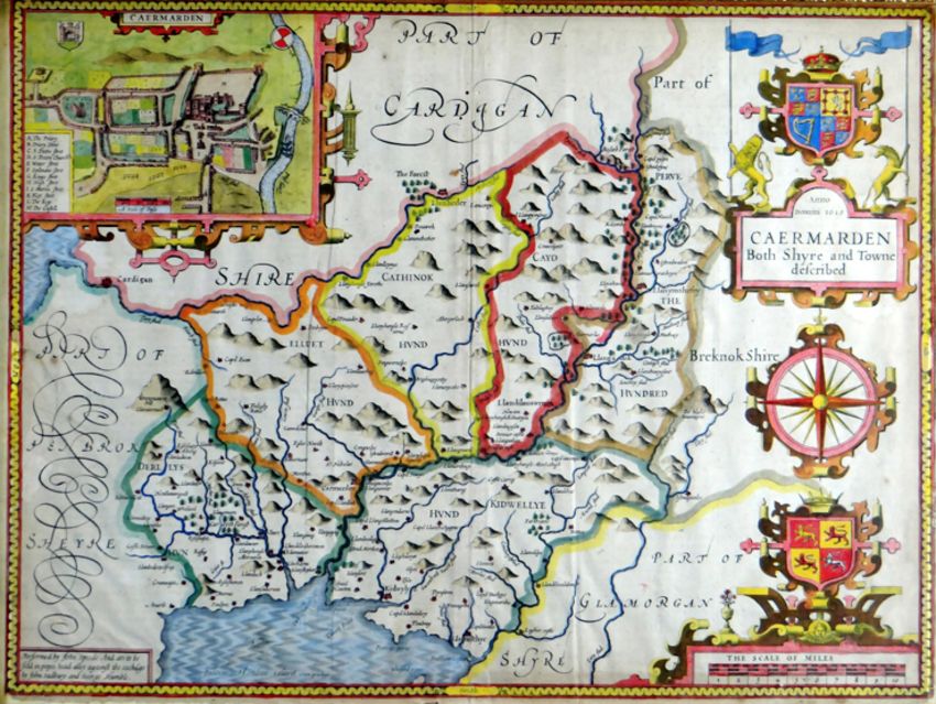 JOHN SPEED antique coloured map of ‘Caermarden - Both Shyre and Towne Described’, Sudbury & Humble edition, 39 x 52cms