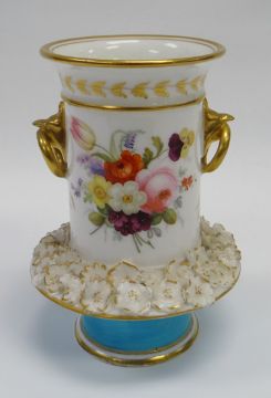 ATTRIBUTED TO NANTGARW PORCELAIN SPILL VASE having a floral encrusted skirt below twin bird-and-ring handles, the body finely painted with a bouquet of flowers to either side, gilding to the handles, borders and rim and with a birds-egg-blue foot, painted ‘Nantgarw’ signature, to the base, 10.5cms high
