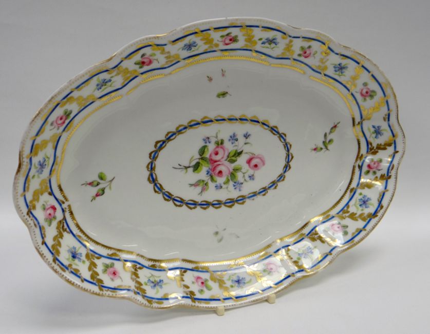 A SWANSEA PORCELAIN OVAL DISH of fluted form, the interior painted with three roses within a blue and gilt frame, the border with further alternate roses with blue flowers and gilt leaves, 29cms long
