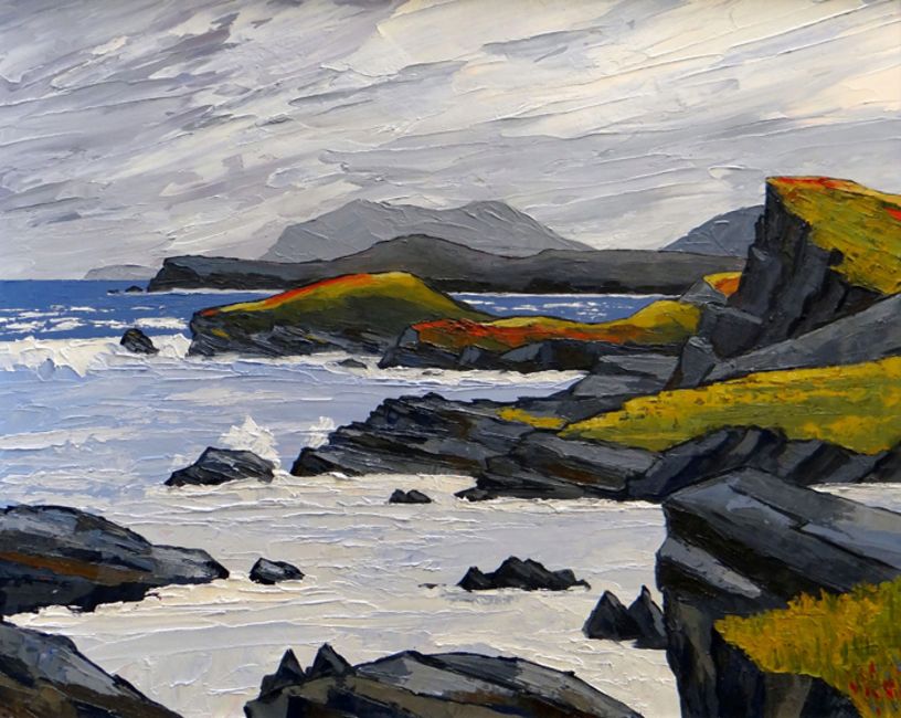 DAVID BARNES oil on board - expansive rocky coast with inlets, signed verso, 60 x 75cms