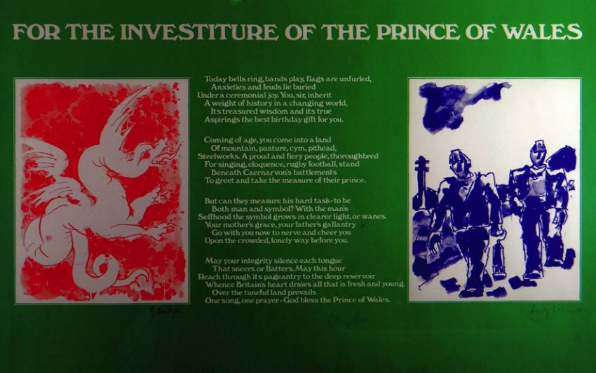 JOHN PIPER / CECIL DAY LEWIS / JOSEF HERMAN off-set coloured lithograph - to commemorate The Investiture of The Prince of Wales having a Dragon design by John Piper together with a Josef Herman illustration of two miners flanking a centre poem by Cecil Day Lewis entitled ‘For the Investiture of The Prince of Wales’, signed by each artist, 48 x 74cms
