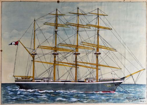 T LAWRENCE EDWARDS watercolour - portrait of the four-master bark ‘Jenny of Amlwch’ which operated 1770-1771, 36 x 50cms. Auctioneer’s note: see page 187 of ‘Ships & Seamen of Anglesey’ by Aled Eames, signed and dated 1919 with title ‘Jenny of Anglesey’