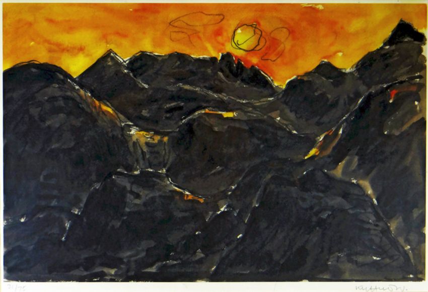 SIR KYFFIN WILLIAMS RA coloured limited edition (31/75) print - sunset over Snowdonia, signed in full, 34 x 50cms