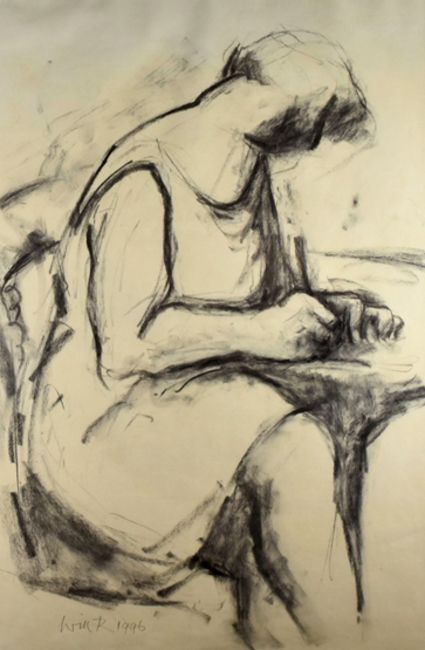 WILL ROBERTS charcoal drawing - female seated at table, entitled and dated verso ‘Girl Writing 1996’, signed and dated 1996, 74 x 49cms