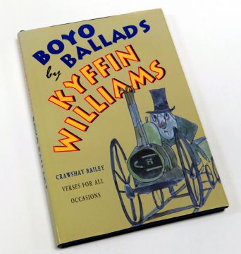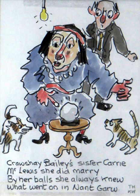 SIR KYFFIN WILLIAMS RA / CRAWSHAY BAILEY cartoon watercolour and pencil - two figures around a ‘crystal ball’ inscribed in pencil ‘Crawshay Bailey’s sister Carrie, Mr Lewis She Did Marry, By Her Balls She Always Knew, What Went on in Nantgarw’, 28 x 20 cms together with a well preserved copy of ‘Boyo Ballads’ by Kyffin Williams with dustcover