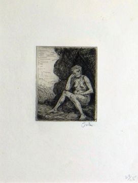 AUGUSTUS JOHN etching - seated nude in a landscape with head on fist, signed, 25 x 19cms