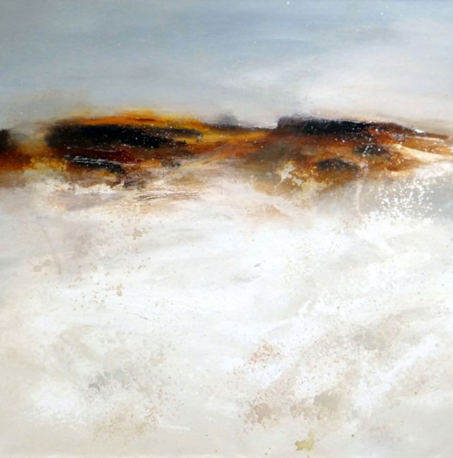 ROSS LOVEDAY acrylic on canvas - shoreline and landscape, entitled verso ‘Bird Watching’, 92 x 92cms