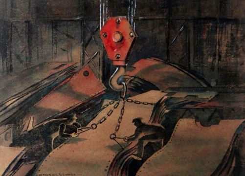 ARTHUR RICHARDS watercolour - steel workers entitled ‘Steel Plates, Purchased from the Arts Councils Exhibition of Contemporary Welsh Paintings 1955’, signed, 33 x 46cms