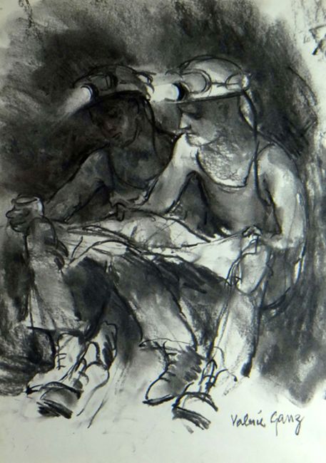 VALERIE GANZ charcoal on paper - study of two miners sitting together on their lunch break, signed, 39 x 28cms