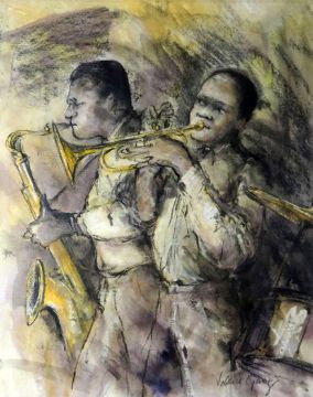 VALERIE GANZ mixed media - figures playing brass instruments in a jazz band, signed, 46 x 36cms