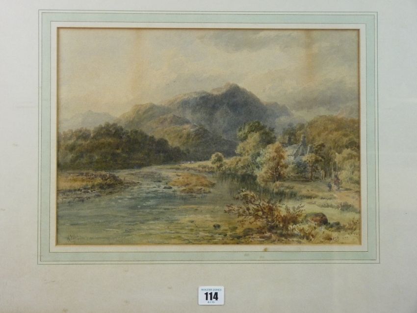 W ELLIS watercolour - landscape on the Mawddach with figures on a track, signed, 26 x 37 cms