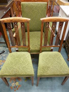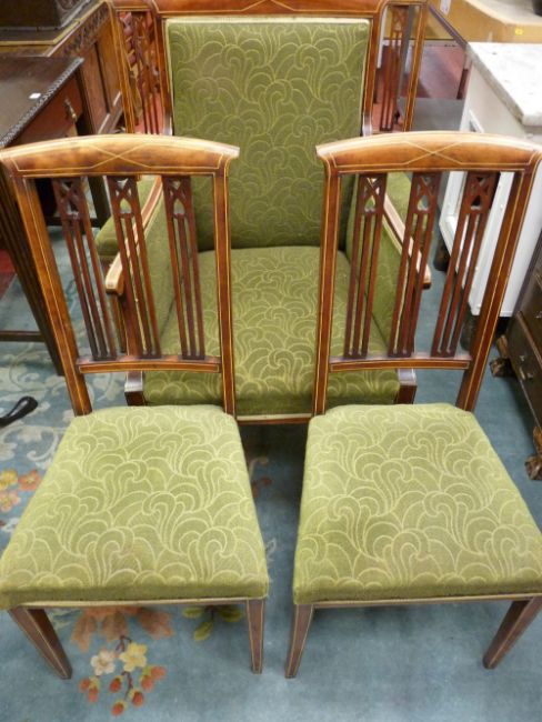 AN EDWARDIAN INLAID MAHOGANY SALON ARMCHAIR AND FOUR HIGH BACKED SIDE CHAIRS, matching inlay and upholstery, the side chairs with triple pierced splats, all on tapering square line inlaid supports