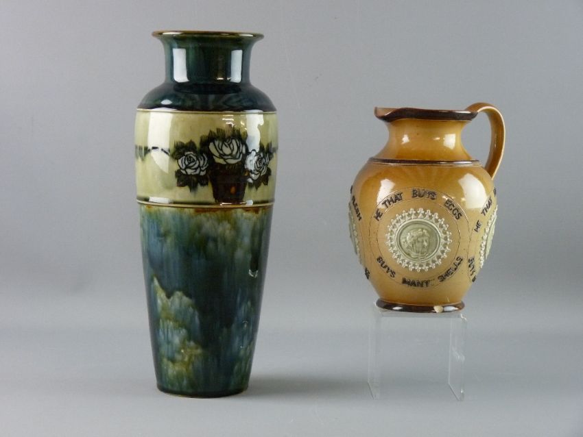 A ROYAL DOULTON STONEWARE VASE AND JUG, the slender baluster shaped vase with flared rim and a single floral decorated and on a blue/green mottled body, impressed factory marks to the base and the nos. 7998K, the jug Doulton Lambeth with raised circular panels 'He That Buys Flesh, Buys Bones etc...', incised and impressed marks to the base with the date 1884, 33 cms and 19 cms respectively, (3/4 chips to base rim)