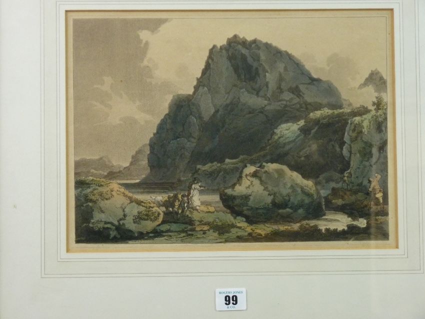 AN EARLY 19th CENTURY AQUATINT - 'Tryfan' with figures and a donkey, 25 x 34 cms
