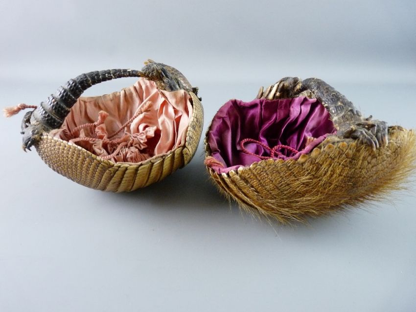 TWO VICTORIAN TAXIDERMY BASKETS formed from armadillo shells with satin lined interiors with drawstring closers