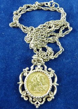 A NINE CARAT GOLD NECK CHAIN AND SOVEREIGN PENDANT, triple link chain, 10 grms, having a scrolled mount and full sovereign for 1910, total weight 17 grms
