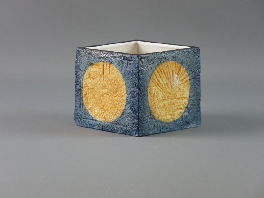 A TROIKA POTTERY SQUARE SECTION VASE, each side with a central orange disc with blue surround and textured finish, marked to the base 'Troika, St Ives, England', 8.5 cms high, (cracked with glaze imperfections)