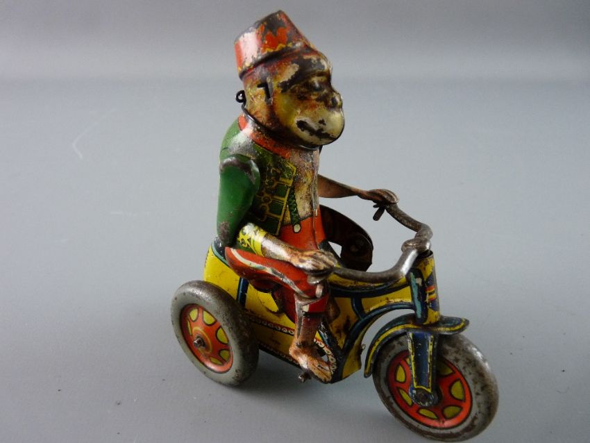 AN ARNOLD TINPLATE MONKEY ON A TRIKE, colourful clockwork German manufactured toy, nicely lithographed with balloon tyres, 9.5 cms approximate length, (working, no key, quite play worn, monkey ears missing, front wheel with some play)