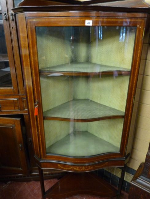 AN EDWARDIAN INLAID MAHOGANY CHINA DISPLAY CABINET, shaped polished top with back rails, single glazed serpentine front door before shaped interior shelves above a swag inlaid frieze, on slender supports with conjoining under tier shelf, 162 x 74 cms