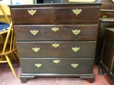 A LATE 18th/EARLY 19th CENTURY MAHOGANY CHEST of two short over three long drawers, crossbanded edge with inverted moulding, pine lined drawers with shaped brass backplates and swing handles and matching escutcheons, raised on corner bracket feet, 102 cms high, 97 cms wide, 58 cms deep approximately, (some restoration required)