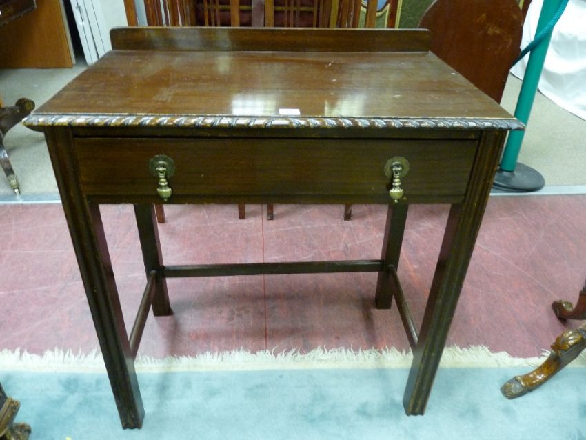 A MAHOGANY SINGLE DRAWER SIDE TABLE, early 20th Century with shallow railback and moulded edge top, Stewart drop handles and backplates on square reeded supports, 75.5 x 76.5 cms