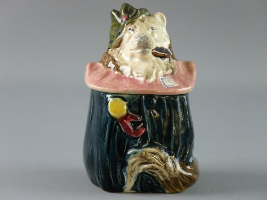 A CONTINENTAL MAJOLICA TOBACCO JAR in the form of a dog in costume with a pink ruff, 13 cms high, incised number 2160 to the base (chipped)