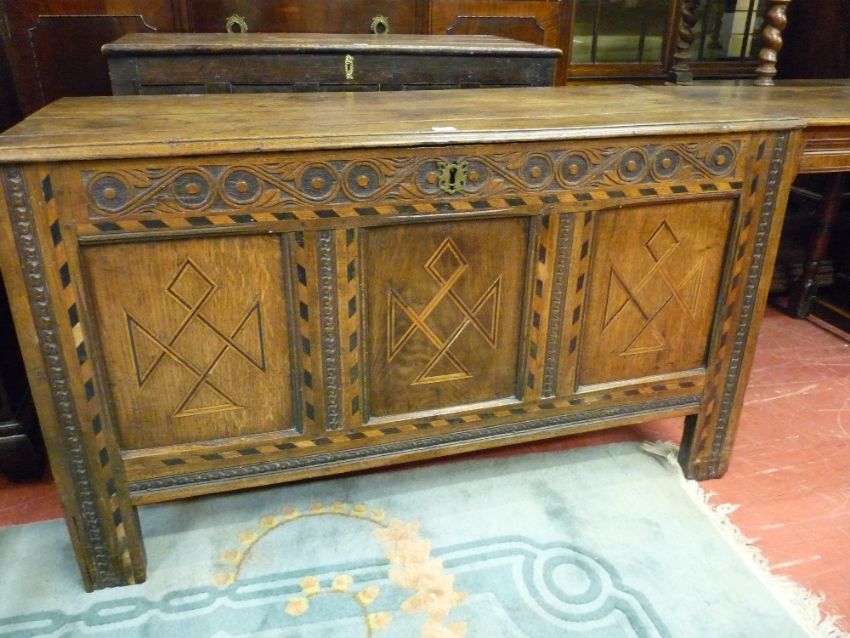 AN ANTIQUE OAK INLAID COFFER, the two plank top with iron pin hinges, leaf and disc frieze decoration and stylized star patterns to the panels with herringbone type inlay surround, 72.5 x 123 cms, (splits to the top, evidence of old worm)