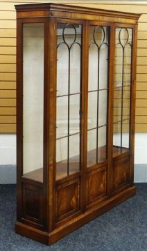 FINE QUALITY REPRODUX CABINET in the Edwardian style mahogany and having two long glazed doors flanking centre glaze section and with cupboard below, 150 x 200cms