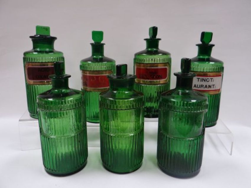 SEVEN GREEN PHARMACEUTICAL BOTTLES, all of similar size, each with stoppers and four with original labels, 21cms high