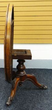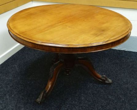 A CIRCULAR TILTING TEA-TABLE on a carved tripod base, 118cms diam