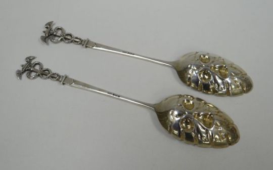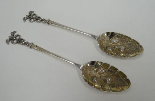 A PAIR OF SILVER BERRY SPOONS WITH ROMANESQUE TERMINALS having opposing serpents and winged finials, the bowls with raised fruit decoration, 23cms long, by James Dixon, Sheffield 1896, 4.4ozs