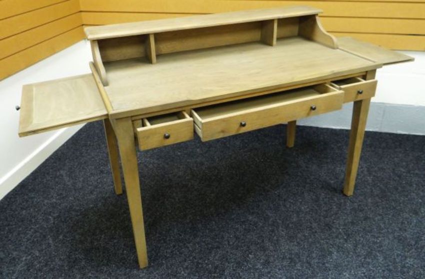 A MODERN LIMED OAK DESK AND CHAIR the chair in grey herringbone upholstery, the desk with upper pigeon hole stage, 125cms