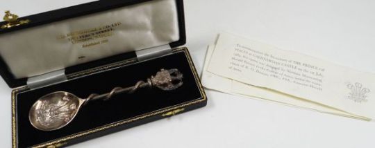 A CASED 1969 PRINCE OF WALES INVESTITURE COMMEMORATIVE SPOON with of heraldic design with Prince of Wales feathers to the bowl, by Norman Manwaring, includes original paperwork, mark for J D Beardmore, London, 2.7ozs