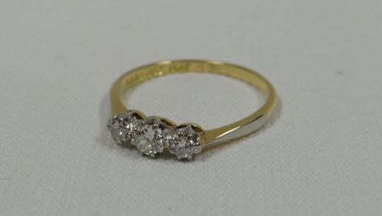 A THREE STONE DIAMOND RING set in 18ct yellow gold, 2.34gms