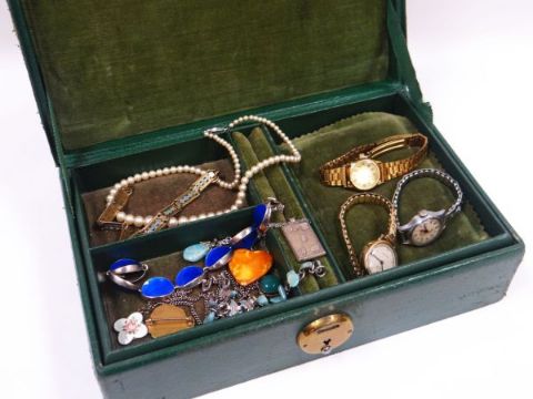 A GREEN VINTAGE JEWELLERY BOX & CONTENTS