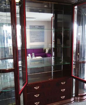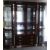 A MODERN LARGE STANDING FOUR DOOR DISPLAY CABINET Italian made in pseudo mahogany having a pair of curved glass flanking side cabinets and a two door centre cabinet above three drawers, 213 x 200cms